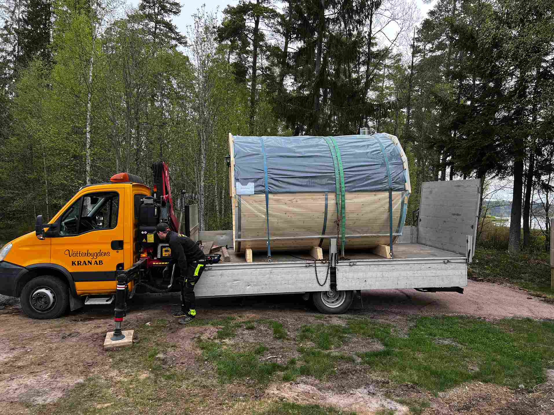 2. Badstuekaret leveres med lastebil til din eiendomsgrense. Du som kunde er da selv ansvarlig for lossing og plassering, noe som enkelt gjøres med gaffeltruck, kran eller traktor med gafler .